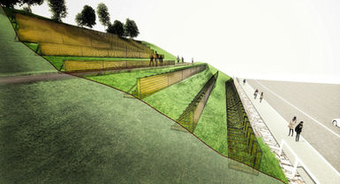 L’intervento nasce con l’obiettivo di stabilizzare e valorizzare un pendio posto in prossimità di un’infrastruttura viaria, trasformandolo in uno spazio fruibile e leggibile, senza alterarne il carattere naturale. Il progetto lavora per sottrazione e ripetizione, introducendo una sequenza ordinata di gradoni che seguono la morfologia del terreno e ne rafforzano la continuità visiva.